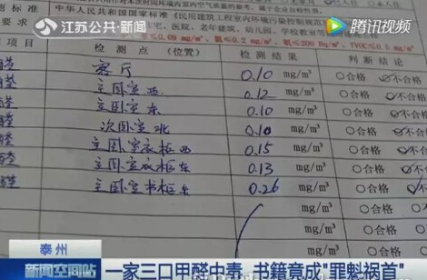 南京一家具有國家資質的環境檢測公司室內空氣檢測員王先生指出,從姜堰這家人的檢測結果來看,幾乎每個房間都屬于輕微超標,而放了很多書籍的書柜超標更多,這并不能說明書本身排放超標。室內空氣中的甲醛都是綜合揮發的結果,地板、書柜、甚至我們的衣服紡織品,都含有甲醛,它們的綜合排放被檢測為數值,而書柜里更為嚴重,只能說有可能是書籍里的甲醛添上了這么一筆,讓數值更高。